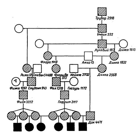 Н. П. Дубинин предлагает определять генетический груз популяции путем сравнения частот мертворожденных в родственных и неродственных подборах родительских пар. При этом следует иметь в виду, что при высокой частоте гетерозигот по рецессивным летальным и полулетальным мутантным генам рождение животных с аномалиями необязательно должно быть связано с инбридингом близких и умеренных степеней. Общий предок (источник мутации) может находиться и в отдаленных рядах родословной. К примеру, бык Трувор 2918 — гетерозиготный носитель мутантного рецессивного гена, находился в V, VI, VII рядах предков в совхозе «Красная Балтика», но при использовании его праправнука Автомата 1597 на родственных ему коровах наблюдались массовые случаи рождения бесшерстных телят (рис. 41).