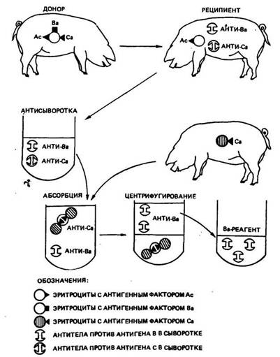 Схема получения моноспецифической сыворотки В приведена на рисунке 42. Кровь от животного-донора, имеющего антигены Ас, Ва и Са, вводят реципиенту с антигеном Ас, но не имеющему антигенов Ва и Са. У реципиента вырабатываются антитела к антигенным факторам Ва и Са. Антитела против антигена Ас не образуются, так как у реципиента есть этот фактор. В сырой сыворотке абсорбируют ненужные антитела, в данном случае анти-Са, эритроцитами третьего животного, имеющего антиген Са. Потом из сыворотки путем центрифугирования удаляют эритроциты с абсорбированными на них антителами Са. Полученную моноспецифическую сыворотку можно использовать для выявления антигена Ва в эритроцитах других животных.