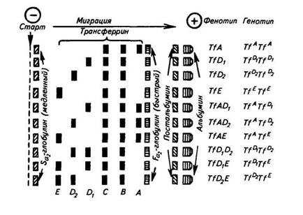 Хорошо изучен полиморфизм трансферрина (Tf), который переводит железо плазмы в диионизированную форму и переносит его в костный мозг, где оно используется вновь для кроветворения. Трансферрин также подавляет размножение вирусов в организме. У человека недостаточность трансферрина может быть следствием некоторых перенесенных заболеваний, в частности наследственного гемохроматоза. Количество Tf снижается при циррозе печени, инфекционных болезнях. На рисунке 47 представлена схема расшифровки электрофореграммы типов трансферрина. Известно 12 аллелей Tf, но среди европейских пород наиболее часто встречаются аллели A, Di, D2 и Е.