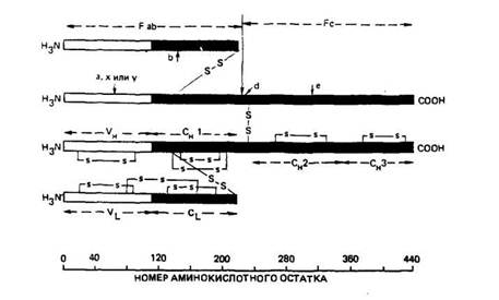 L — легкие и Я—тяжелые цепи; V— вариабельные области легких и тяжелых цепей (светлые); С — константные области зачернены; s — s — дисульфидиые связи; Vl и Cl — домены, составляющие вариабельные и константные участки легких цепей, Ун, Сн1, Сн2, СнЗ—.Домены, составляющие вариабельные и константные участки тяжелых цепей; Fab (два) и Fc (один) — фрагменты, образующиеся при расщеплении папаином; а, х, у, b, d, e — локализация известных аллотипических групп