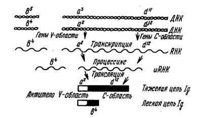 Иммуноглобулины контролируются тремя семействами генов, расположенными в разных хромосомах. Одно семейство кодирует синтез всех классов тяжелых цепей (Н), другое — синтез легких к-цепей, третье — синтез легких Х-цепей.