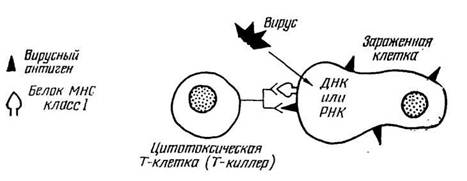 Мембране (рис. 54). Цитотоксические Т-клетки (Т-киллеры) своими рецепторами специфически узнают вирусные антигены только в комбинации с белком -главного комплекса гйстосовместимости (МНС) класса I, которые имеются почти на всех клетках организма. МНС класса I определяют иммунологическую индивидуальность клетки. В отличие от антител Т-рецепторы не узнают и не связывают антиген, если тот не находится вместе с белком МНС. После узнавания антигенов цитотоксические Т-клетки убивают зараженные вирусом клетки.