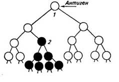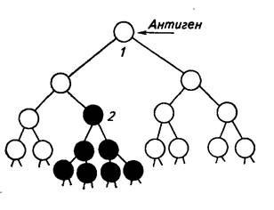 Из многих теорий иммунитета наибольшее признание получила клонально-селекционная теория Ф. Бернета (1959). Она основана на четырех основных принципах: 1) в организме имеется большое число лимфоидных клеток; 2) популяция Лимфоидных клеток гетерогенна, и в результате интенсивного деления клеток образуется большое число клонов (популяция клеток, происходящая от одного предшественника); 3) небольшое количество антигена стимулирует клон клеток к размножению; 4) большое количество антигена элиминирует соответствующий клон. Согласно этой теории антиген, взаимодействуя с рецептором клетки (В-клетки), вызывает ее интенсивную пролиферацию (деление), в результате чего образуется клон, синтезирующий антитела одной специфичности. Все клетки клона имеют один и тот же генотип. При соматических мутациях одного клона могут возникать новые клоны (рис. 55).