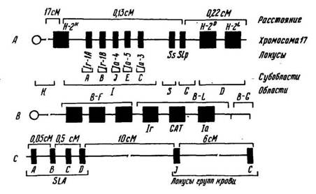 МНС свиней SLA состоит из четырех тесно сцепленных локусов (см. рис. 56). Три локуса (А, В, С) контролируют класс трансплантационных 1-антигенов. Продукты этих генов сходны с теми, которые детерминируются субобластями А, В, С у человека и Н-2К и H-2D у мышей. Четвертый локус (D) включает гены, которые кодируют серологически определяемые молекулы класса II и реакцию смешанных лимфоцитов. Гены иммунного ответа (1г) сцеплены с главным комплексом гистосовместимости. В настоящее время ряд исследователей картировали главный комплекс гистосовместимости на 7-й хромосоме. Предполагают, что