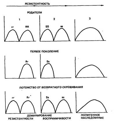 Устойчивость или восприимчивость к болезням иногда зависит от одного или немногих генов, но чаще определяется множеством локусов. Полигенный контроль устойчивости к болезням не дает возможности разграничить фенотипы вследствие маскирующего действия условий среды и небольшого эффекта отдельных генов. При полигенном наследовании в популяции наблюдается нормальное распределение по устойчивости или восприимчивости у родителей и гибридов первого поколения. Генетический контроль резистентности может быть изучен при скрещивании родителей с контрастными фенотипами и анализе гибридов Fi, а также потомства от скрещивания Fi с родительскими формами. На рисунке 62 показано распределение родителей в случае эффекта доминирования резистентности (R) и доминирования восприимчивости (S). Возвратное скрещивание особей Fj с рецессивной родительской формой (анализирующее скрещивание) дает бимодальное распределение.