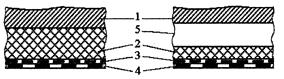 1 – стена (потолок); 2 – звукопоглощающий материал; 3 – защитная оболочка; 4 – защитный перфорированный слой; 5 – воздушный промежуток