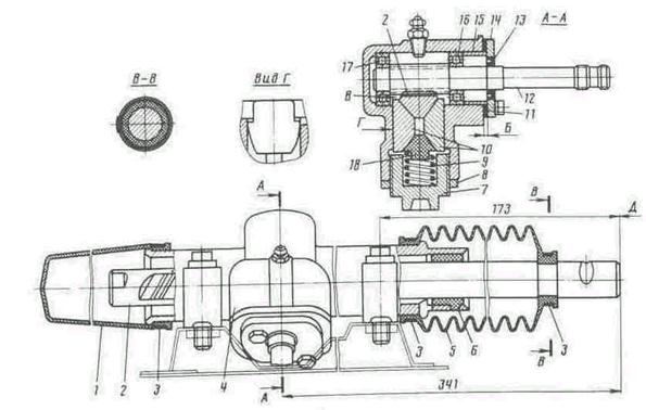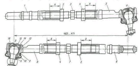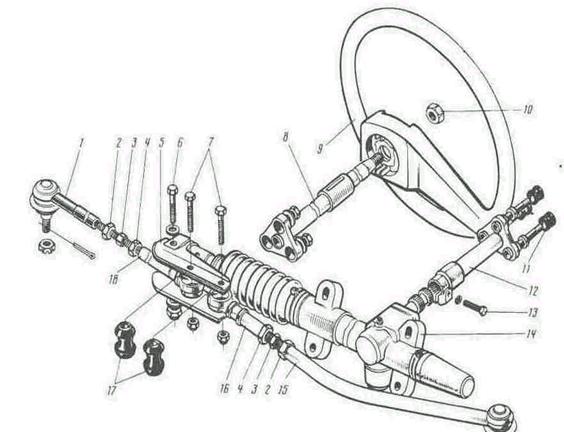 Тяги 1 і 15 зовнішніми кінцями кріпляться до поворотних важелів, приварених на стійках передньої підвіски, а внутрішнім – до кронштейна 5 тяг, встановленому на хвостовик рейки.