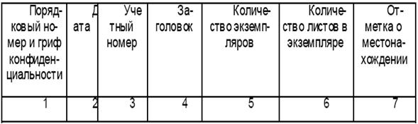 Если документы издаются с одним грифом конфиденциальности, то в наименовании графы 1 слова "и гриф конфиденциальности" опускаются, рядом с номерами документов гриф не проставляется. В графе 3 проставляется учетный номер документа, присвоенный ему по журналу учета изданных документов. Графы 14 обязательны, целесообразность включения граф 57 должна определяться главным образом объемом и характером справочной работы по документам.