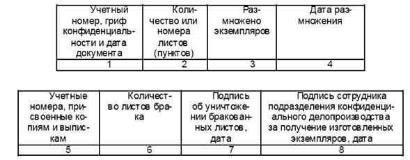 При поступлении документа на размножение заполняются графы 1-2 журнала. В графе 1 гриф конфиденциальности проставляется аббревиатурой. В графе 2 указывается общее количество листов документа. Если размножается документ, изданный данным предприятием процессе размножения номер экземпляра документа, с которого осуществляется размножение, на размноженных экземплярах не воспроизводится. При размножении поступивших документов номер экземпляра воспроизводится. Учетный номер, присвоенный документу, сохраняется на размноженных экземплярах. После размножения документа заполняются графы 3, 4 и (при наличии брака) 6, 7 журнала учета размножения конфиденциальных документов. В графе 3 указывается общее количество размноженных экземпляров без проставления их номеров. В графе 6 отражается общее количество листов брака без перечисления их номеров. Эти листы уничтожаются с помощью бумагорезательной машины или разрываются и помещаются в опечатанную урну, после чего работник, производивший размножение документа и уничтожение бракованных листов, расписывается в графе 7 с проставлением даты. Графа 8 включается в журнал и заполняется в случаях, когда размножение производится в специальном множительном подразделении. Подпись за возврат документа, с которого производилось размножение, проставляется в учетной форме, по которой осуществлялась его передача в специальное множительное подразделение. На размноженных экземплярах работник подразделения конфиденциального делопроизводства проставляет их номера. При этом если документ был издан данным предприятием, то номера размноженных экземпляров продолжают номера ранее изготовленных экземпляров, если документ был издан другим предприятием, то на размноженных экземплярах их номера проставляются дробно: в числителе на всех экземплярах остается номер, присвоенный предприятием, издавшим документ, а в знаменателе на каждом экземпляре проставляется присвоенный ему порядковый номер, начиная с № 1. На каждом размноженном экземпляре в реквизите "Отметка об исполнителе" проставляется только учетный номер, присвоенный документу при его издании, независимо от места издания, фамилия, имя, отчество исполнителя и его рабочий телефон (если проставлен на размножаемом экземпляре). На экземпляре, с которого производилось размножение, под разрешением на размножение работник подразделения конфиденциального делопроизводства производит запись: "Размножено _____ экз. с № ____ по № ____", которая заверяется его подписью с проставлением даты. Если размноженные экземпляры не воспроизводят подпись, то они удостоверяются печатью предприятия или подразделения конфиденциального делопроизводства, которая проставляется с захватом части слова, обозначающего должность лица, подписавшего документ. При размножении документов, зарегистрированных в журнале учета изданных документов, количество размноженных экземпляров проставляется в графе 6 ниже ранее проставленных через знак «+». При размножении документов, зарегистрированных по журналу учета поступивших документов, отметка о размножении производится в графах 6, 7 ниже проставленных листов и оформляется следующим образом: "Размножено _____экз.". При размножении документов, зарегистрированных в журнале учета документов выделенного хранения, отметка о размнож