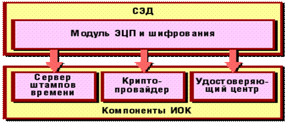 Функционирование СЭД с ЭЦП обеспечивают четыре компонента: программно-аппаратный комплекс СЭД, имеющий в составе модуль “ЭЦП и шифрование”, программно-аппаратные комплексы службы штампов времени и удостоверяющего центра, а также несколько криптопровайдеров.