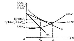 Однако, цена РМ на товар монопольно конкурентной фирмы будет выше цены РC, равной величине LRACmin, которая была бы, если бы эта фирма принадлежала к совершенно конкурентной отрасли. Это объясняется дифференциацией продукции у монопольно конкурентных отраслях. Пока товар дифференцирован среди фирм, невозможно добиться того, чтобы в долгосрочном равновесии средние издержки достигли своего минимального уровня. Нулевая прибыль требует того, чтобы график спроса являлся касательной к кривой средних издержек. Это может произойти только при объеме выпуска продукции, соответствующем LRACmin, если график спроса является горизонтальной линией, как при совершенной конкуренции. Монопольно конкурентные фирмы не добиваются всего возможного в долгосрочном плане снижения средних издержек. Так как спрос на товар монопольно конкурентной фирмы, ввиду дифференциации продукта, не является совершенно эластичным, и его график представляет собой наклоненную вниз линию, то точка касания этой линии к кривой средних издержек определяет цену товара PМ=LRACМ>LRACmin.