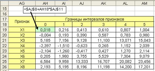 Скопируем формулу по строке (протянем формулу) и получим все границы интервалов частотного ряда первого признака. Аналогично рассчитаем границы интервалов по всем восьми признакам таблицы данных. Результаты приведены на рис. 3.5.