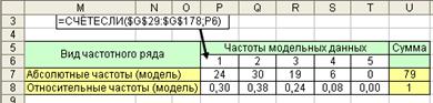 Четвертый шаг. На этом шаге определяются номера интервалов для точек, включенных в модельный ряд. Результаты расчетов разместим в столбце R. Эти данные необходимы нам для расчета частотного ряда по модельным данным. Для отбракованных точек значение определим как -1. В принципе, отбракованные точки можно отбросить из таблицы данных с помощью автофильтра, а затем произвести перенумерацию строк таблицы данных. Заметим, что результирующая модельная выборка будет содержать меньшее количество точек чем исходные последовательности случайных чисел. В нашем случае из 150 точек отобрано всего 79 точек. То есть мы заранее не можем точно знать, сколько точек получим в моделируемом ряду.