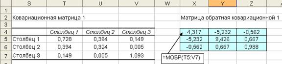 - расчет матрицы обратной ковариационной с помощью функции МОБР (пример использования функции МОБР приведен в приложении "Операции над матрицами");