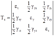 Выделим в теле прямоугольный параллелепипед. После нагружения он трансформируется в косоугольный, то есть появляются линейные и угловые деформации. Деформированное состояние характеризуется тензором деформаций. Этот тензор будет симметричным, так как gху = gух (угловые деформации одного и того же прямого угла).
