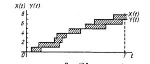 до момента t. И та, и другая функции являются случайными и меняются скачком (увеличиваются на единицу) в моменты приходов заявок (X (t)) и уходов заявок (Y(t)). Вид функций X(t) и Y(t) показан на рис. 19.2; обе линии — ступенчатые, верхняя — X(t), нижняя— Y(t). Очевидно, что для любого момента t их разность Z (t) = X(t) — Y(t) есть не что иное, как число заявок, находящихся в СМО. Когда линии X(t) и Y(t) сливаются, в системе нет заявок.