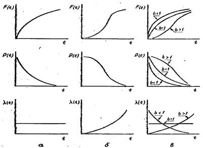 Рисунок 3.1 – Графики функций f(t), F(t), P(t), l(t) для экспоненциального (а), нормального (б), распределений и распределения Вейбула-Гнеденко (в)