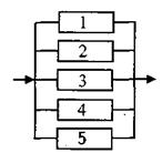 2) система «m из n» показана на рисунке 5.1, б - аналогичная схема, но здесь, допустим, необходимо, чтобы для нормальной работы системы функционировали 2 из 5 или 3 из 5 элементов; в общем виде такие системы - это случаи функционирования m из n элементов;