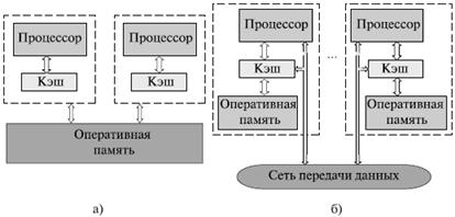 Рис. 1.5. Архитектура многопроцессорных систем с общей (разделяемой) памятью: системы с однородным (а) и неоднородным (б) доступом к памяти