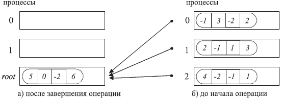 · передача сообщений должна быть выполнена всеми процессами, результат операции будет получен только процессом с рангом root;