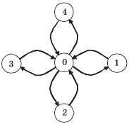 Для примера создадим топологию графа со структурой, представленной на рис. 5.9. В этом случае количество процессов равно 5, порядки вершин (количества исходящих дуг) принимают значения (4, 1, 1, 1, 1), а матрица инцидентности (номера вершин, для которых дуги являются входящими) имеет вид: