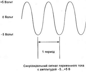 Частотой переменного тока называется мера повторяемости сигнала. Например, напряжение в настенной розетке совершает один полный цикл изменения 50 раз в секунду. На следующем рисунке показан синусоидальный сигнал, который совершает постоянные переходы от -5 В к +5 В. Говорят, что сигнал имеет частоту 50 Гц, если он совершает 50 циклов в секунду.