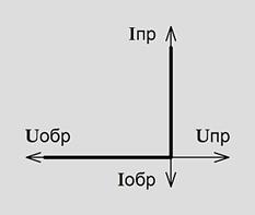 Идеальный полупроводниковый диод допускает протекание бесконечно большого прямого тока и выдерживает бесконечно большое обратное напряжение. Это отражено на вольтамперной характеристике, изображённой на рисунке 13.