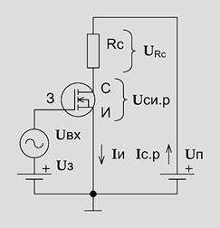 Динамическим режимом работы называют такой режим, в котором к транзистору, который усиливает входной сигнал, подключена нагрузка. Такой нагрузкой может служить резистор Rс, подсоединённый последовательно со стоком полевого транзистора, включённого по схеме с общим истоком, что показано на рисунке 30.