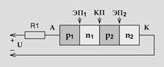 Вывод от внешней зоны n2 называют катодом, а от зоны p1 – анодом. Зоны n1 и p2 носят название баз динистора. Переход между зонами p1, n1 и p2, n2 именуют эмиттерным, а между зонами n1 и p2 – коллекторным переходом.