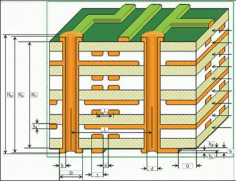 Схематически (упрощенно) фрагмент конструкции современной многослойной печатной платы приведен на рисунке 9.2. Проводники в таких печатных платах размещаются не только на поверхности, но и в объеме подложки. При этом сохранилась слойность расположения проводников относительно друг друга (следствие использования планарных полиграфических технологий). Слойность неизбежно присутствует в названиях печатных плат и их элементов — односторонняя, двухсторонняя, многослойная и др. Слойность реально отражает конструктив и соответствующие этому конструктиву технологии изготовления печатных плат.