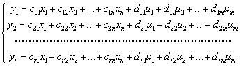 Для полного описания системы в пространстве состояний к уравнениям динамики (8) или (8 а) необходимо добавить уравнения, устанавливающие связи между переменными состояния x1,..., xп и выходными переменными y1,...,yr между входными u1,..., um сигналами и выходными переменными y1,...,yr. Эта связь выражается в виде системы линейных алгебраических уравнений: