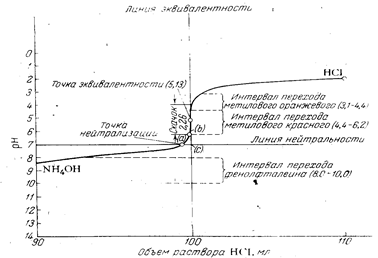 Следует отметить, что до достижения точки эквивалентности, т. е. тогда, когда еще не весь NH4OH нейтрализован и прилито только 99,8 мл 0,1 н. раствора НС1, рН раствора меньше 7 (6,55), а среда раствора становится кислой.