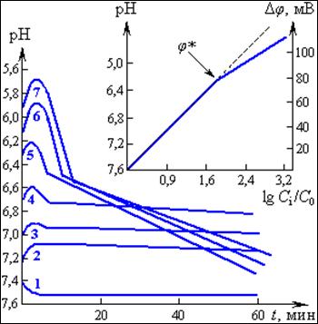 При потенциале выше j* наблюдается: снижение DрН (кривые 5 – 7), перелом на кривой зависимости потенциала от логарифма концентрации ионов хлора (вставка) и выход гемоглобина из эритроцитов (на рисунке не показано).