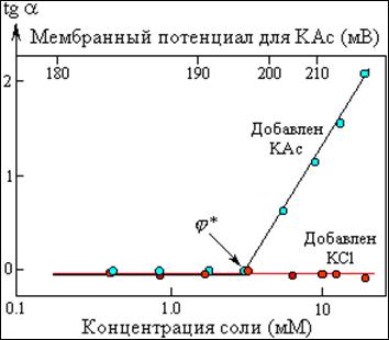 Рис.13. Зависимость скорости падения мембранного потенциала (tga на рис. 12) от концентрации добавленного ацетата (нижняя ось) и мембранного потенциала (верхняя ось)