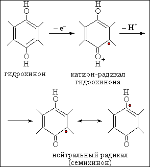 Биологическое окисление субстратов клеточного дыхания, таких как глюкоза, пировиноградная и янтарная кислота и другие, осуществляется, как известно, в два этапа. На первом этапе в цикле трикарбоновых кислот происходит последовательный отрыв атомов водорода от субстрата и образование восстановленных форм пиридиннуклеотидов НАДН и НАДФН. На втором этапе электроны от НАДН и НАДФН переносятся по так называемой дыхательной цепи на кислород. В состав дыхательной цепи входят флавопротеиды, комплексы негемового железа, убихинон и гемопротеиды (цитохромы a,b и c и цитохром-оксидаза). Схема дыхательной цепи дана на рис. 4. Важным звеном цепи переноса электронов служит убихинол (коэнзим Q)(см. рис. 5), радикал которого (семихинон, ·QH) образуется либо при одноэлектронном окислении убихинола (QH2, гидрохинон-форма) (см. рис. 6), либо при одноэлектронном восстановлении убихинона (Q) (см. рис. 7). В норме радикал этот – не более как рядовой участник процесса переноса электронов; но при нарушении работы дыхательной цепи он может стать источником других, менее безобидных радикалов, в первую очередь, радикалов кислорода.