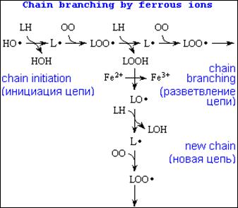 Существенное ускорение пероксидации липидов наблюдается в присутствии небольших количеств ионов двухвалентного железа. В этом случае происходит разветвление цепей в результате взаимодействия Fe2+ c гидроперекисями липидов: