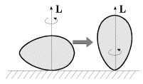 Следует обратить внимание, что в процессе переворачивания волчка результирующий момент импульса сохраняет свое первоначальное направление, то есть вектор L, все время направлен вертикально вверх. Это означает, что в ситуации, изображенной на рис. 109, б, когда ось волчка горизонтальна, вращение вокруг оси симметрии волчка отсутствует! Далее, при опрокидывании на ножку, вращение вокруг оси симметрии будет противоположно исходному (если смотреть все время со стороны ножки, рис. 109, в).