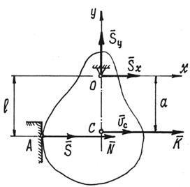 Тело, вращаясь вокруг горизонтальной оси О, ударяется о преграду А (рис.114). Определим ударные импульсы сил, возникающих в подшипниках на оси,