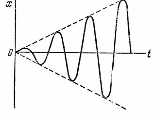 , т.е. когда частота возмущающей силы равна частоте собственных колебаний, имеет место так называемое явление резонанса. Размахи вынужденных колебаний при резонансе будут со временем неограниченно возрастать так, как показано на рис.35.
