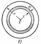 3. Круглая однородная пластина или цилиндр радиуса R и массы М. Вычислим момент инерции круглой пластины относительно оси Сz, перпендикулярной к пластине и проходящей через ее центр (см. рис.34, а). Для этого выделим элементарное кольцо радиуса r и ширины dr (рис.34, б).