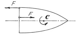 Например, если на тело начнут действовать две силы, образующие пару сил (рис.38), то центр масс С его будет двигаться по прежней траектории. А само тело будет вращаться вокруг центра масс. И неважно, где приложена пара сил.