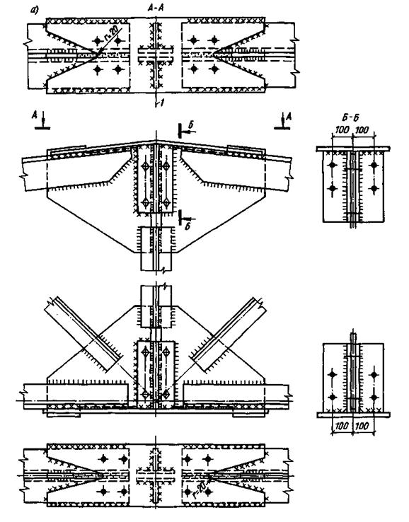 а – узел без фасонки; б – узел с дополнительной фасонкой и изменением сечения пояса встык; в – узел с изменением сечения пояса с помощью накладки и вставки; г – узел фермы с перекрестной решеткой из уголков