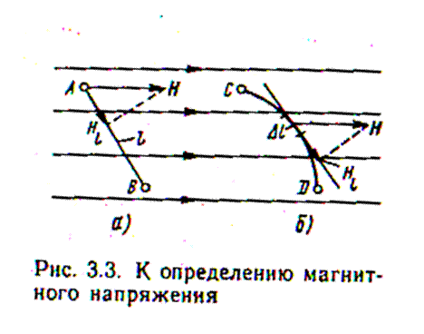 Магнитное напряжение (рисунок 3.3, а) в однородном магнитном поле определяется как произведение проекции Hl вектора Н на отрезок АВ и длину этого отрезка l: