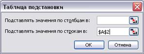 Для цього спочатку визначають місце під таблицю (А2:С5), клітинку А2 залишають порожнєю, тобто це місце шуканого значення х. У діапазоні А3:А5 вводять різні варіанти х, в В2 та С2 записують відповідні функції. Виокремлюють діапазон А2:С5 та обирають команди Данные àТаблица подстановки… (Рис.16). У вікніу відповідному полі встановити адресу шукаємой клітинки А2. У результаті зя’виться таблиця з результатами подстановки різних значень змінних у одну чи декілько формул.