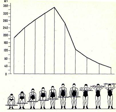 Известно, что сила действия зависит от положения тела спортсмена. Поэтому необходимо строить технику таким образом, чтобы наибольшую силу действия проявлять в наиболее выгодном для этого положении. Например, при разной высоте грифа штанги над помостом штангист может к ней приложить неодинаковую силу (Рис 3) При правильной технике спортсмен акцентирует проявление мышечных усилий в наиболее выгодной для этого позе (так называемый подрыв штанги).