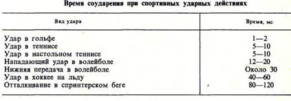 Многие ударные спортивные действия нельзя рассматривать как «чистый» удар: время ударного взаимодействия в них хотя и мало (таблица 1),но пренебрегать им нельзя. Путь ударного взаимодействия, по которому во время удара движутся вместе соударяемые тела, может достигать 20- 30 см. Поэтому в спортивных ударных действиях, можно изменить количество движения во время соударения за счет действия сил, не связанных с самим ударом