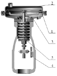 У мембранних виконавчих механізмах (мал. 1, 2) тиск керуючого повітря впливає на мембрану 1, затиснуту по периметрі між кришками 2 і 3, і створює зусилля, що зрівнюється розміщеної в кронштейні 4 приводи пружиною 5. Таким чином, хід штока 6 привода пропорційний величині керуючого тиску. Твердість і попередній стиск пружини визначає діапазон зусиль привода й номінальний хід.