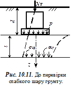 - вертикальні напруження під цетром фундаменту відповідно від власної ваги грунту та додаткового навантаження, визначені на верхній межі слабкого шару (рис. 10.12);