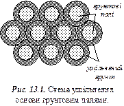 Ущільнення основ грунтовими палями. Суть методу полягає в тому, що в грунті пробивають чи пробурюють свердловини, які заповнюються грунтом з пошаровим його ущільненням. При цьому ущільнюється просідаючий грунт навколо свердловин (рис 13.1).