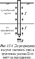 Несуча здатність паль в грунтових умовах I- го типу за просіданням (рис. 13.3) визначається з умови, що такі грунти зменшують несучу здатність при замочуванні. Значення опору грунту на бічній поверхні паль (f) межах просідаючої товщі слід приймати рівним нулю.
